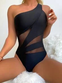 Sima, kontrasztos hálós egy vállú, egyrészes fürdőruha
